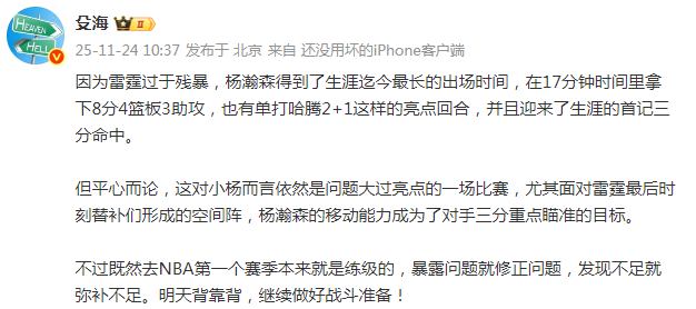 “因为雷霆过于残暴,杨瀚森得到了生涯迄今最长的出场时间,在17分钟时间里拿下8分4篮板3助攻,也有单打哈腾2+1这样的亮点回合,并且迎来了生涯的首记三分命中。”殳海在社媒上写道。