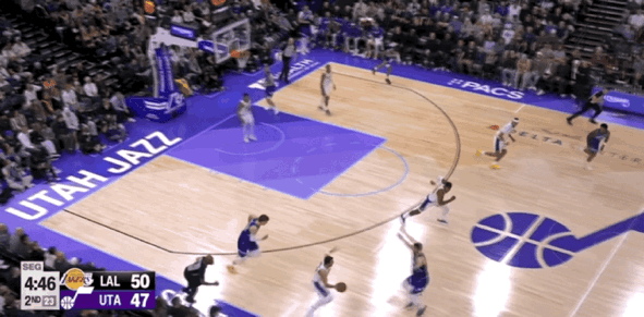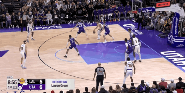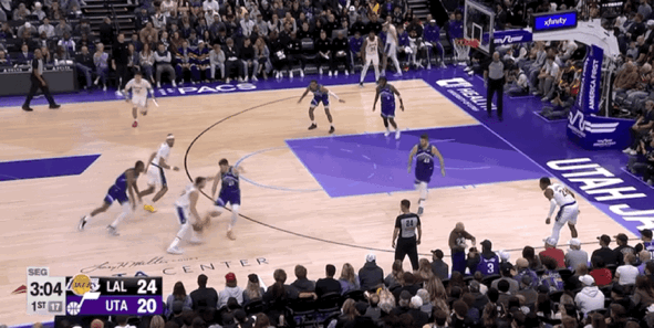 这是双方在6天以内的再次较量,东契奇联手詹姆斯率队欲取连胜。首节比赛,詹姆斯与里夫斯完成配合为湖人取得首次运动战进球,东契奇以一记高难度转身跳投2+1取得个人首分。东契奇持续带来中投威胁,与爵士展开进攻端互飙,后续引领湖人打出一波10-0的进攻高潮,东契奇再次打出极限上篮2+1。