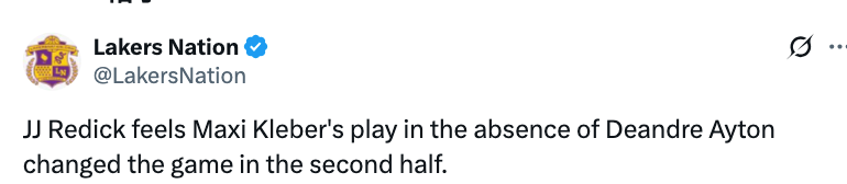 另外雷迪克认为,在艾顿伤退的情况下,克勒贝尔下半场的表现扭转了比赛局面:“克勒贝尔下半场登场,用他的身体对抗彻底改变了比赛走势。”此役克勒贝尔替补出战13分钟,拿到2分3篮板。