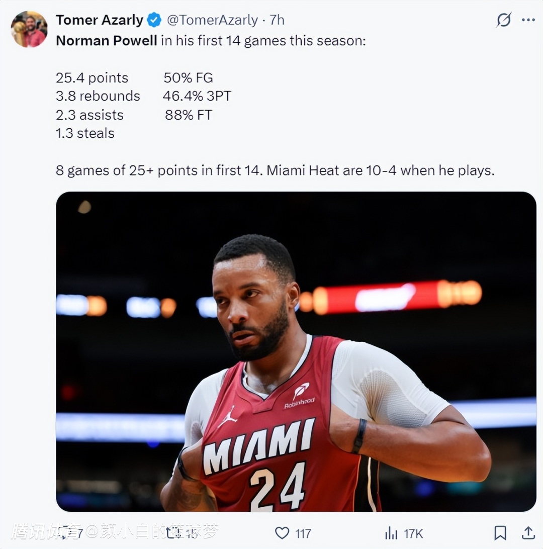 2025-11-24 14:00热火127-117大胜费城拿到四连胜,迈阿密人已经不声不响升至东部第三,他们的阵容跟上赛季比并无太大改变,唯一的改变就是增加了诺曼-鲍威尔这位有着鲍科比美誉的得分手,他的到来让这支热火焕然一新。