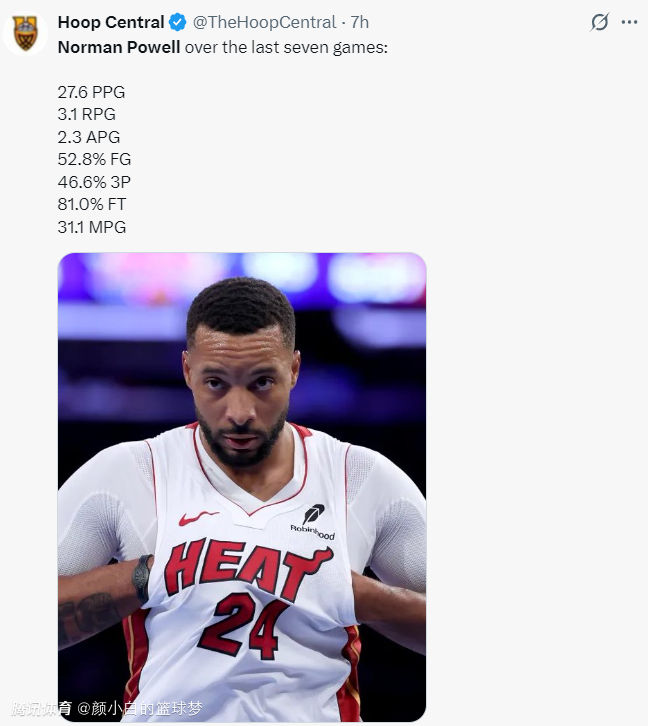 美媒写道:热火队史只有詹姆斯、韦德赛季平均达到过25分,目前鲍威尔场均超过25分,他有希望成为热火队史第三人。