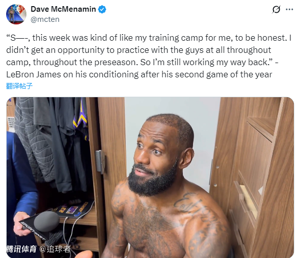谈到自己目前的状态,詹姆斯赛后爆粗表示:“该死(Sh*t),老实说,这周对我来说就像训练营一样。在整个训练营和季前赛期间,我都没有机会和队友们一起练习。我还在努力恢复中。”