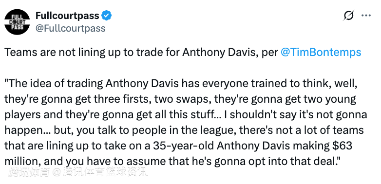 Tim Bontemps表示:“一提到交易安东尼-戴维斯,大家本能会觉得他能换到3个首轮签、2个选秀互换权,还能得到两名年轻球员之类的筹码。我不是说这完全不可能发生,但你去问联盟里的人就知道,没多少球队愿意接手届时35岁、年薪6300万美元的安东尼-戴维斯,而且你得默认他会执行这份合同的球员选项。”