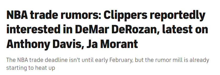 交易流言汇总:快船兜售科林斯有意德罗赞 独行侠送走浓眉难度较大