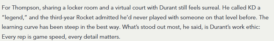 对阿门-汤普森而言,能与杜兰特共处一间更衣室、同场征战虚拟赛场,至今仍让他觉得不可思议。他称杜兰特为 “传奇人物”,这位三年级火箭球员坦言,自己此前从未与如此级别的球星并肩作战。这段学习历程虽充满挑战,却也收获满满。他表示,最让自己印象深刻的是杜兰特的职业态度:每一次训练都以比赛强度投入,每一个细节都力求极致。