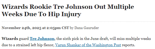 2025-11-25 05:40北京时间11月25日,据《华盛顿邮报》记者Varun Shankar报道,奇才队新秀后卫、今年6月选秀大会的6号秀特雷-约翰逊,因左髋屈肌拉伤将缺席数周比赛。
