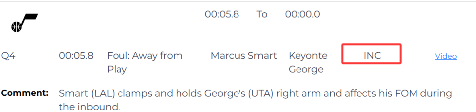 第二次漏判发生在距离比赛结束还有5.8秒,湖人球员斯马特在发球阶段夹住并按住爵士球员乔治的右臂,干扰其接球动作,并导致他摔倒。这是一次漏吹的防守犯规,同样是湖人获利,爵士吃亏。