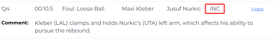 第一次漏判发生在距离比赛结束还有10.5秒,湖人球员克勒贝尔夹住并按住爵士球员努尔基奇的左臂,影响其争抢篮板的能力。这是一次漏吹的抢篮板犯规,湖人获利,爵士吃亏。