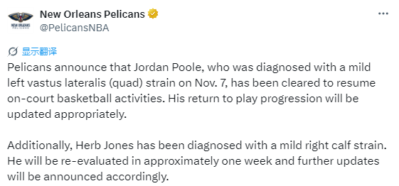 2025-11-25 07:00北京时间11月25日,鹈鹕官方发布公告,宣布此前被诊断出左股外侧肌(大腿前侧)轻度拉伤的乔丹-普尔,现已获准恢复场上篮球活动,其复出进度将适时更新。