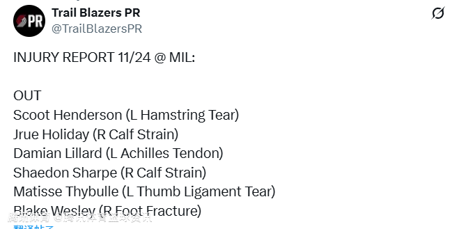 开拓者更新今日对阵雄鹿伤情:夏普等6人缺战 克林根罗威均可上场