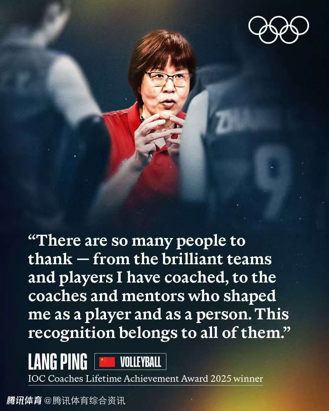郎平在获奖后表示:“获得这个奖项是莫大的荣幸,我由衷感谢国际奥委会和国际排联对我执教工作的认可。我要感谢的人太多了——从我在中国、意大利和美国执教过的优秀队伍和球员,到从我接触这项运动之初就塑造我球技和人格的教练和导师们。这份荣誉属于他们所有人。”