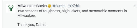 在视频中重现了利拉德在雄鹿队征战期间的精彩表现,雄鹿队官方还在社交媒体上晒出为利拉德制作的海报,并发文写道:“在密尔沃基的两个赛季,见证了你的坚韧不拔、关键得分与诸多难忘瞬间。感谢你,利拉德。‘利拉德时刻’将永远铭刻在我们的队史之中。”