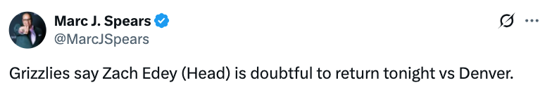 2025-11-25 10:00北京时间11月25日,NBA常规赛,灰熊对阵掘金,灰熊球员扎克-伊迪首节头部受伤,本场比赛大概率无法回归。