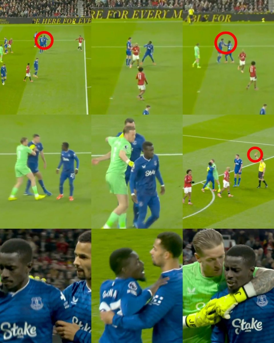 事情起源于曼联队长布鲁诺·费尔南德斯的第一脚射门,葡萄牙国脚将球打偏了。然而,出自曼联青训体系的埃弗顿中卫基恩不满盖耶没有及时回防,后者不甘被骂迅速回应,两位球员互相指责之下发生肢体冲突。