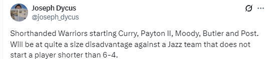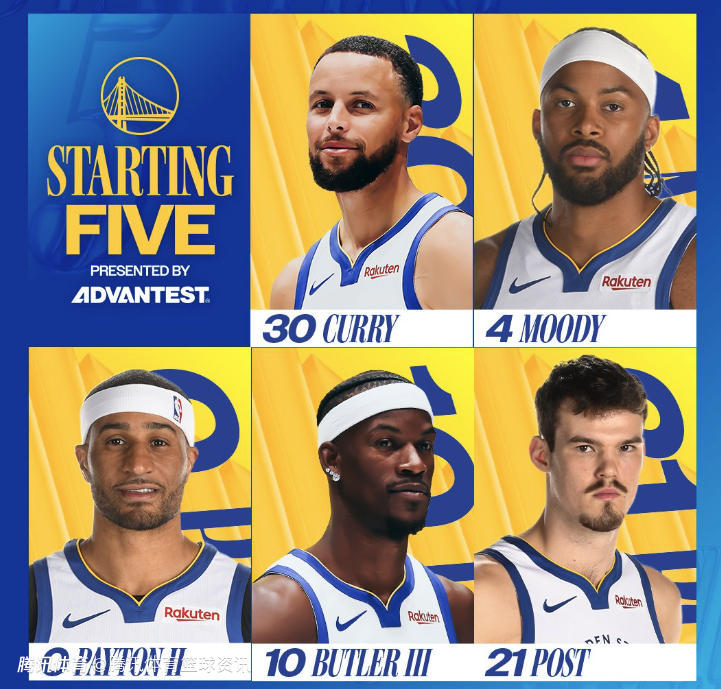 勇士队的首发阵容为:库里、穆迪、佩顿二世、吉米-巴特勒和波斯特。此役,勇士队的德雷蒙德-格林(右脚中部扭伤)、库明加(双膝肌腱炎)和霍福德(右侧坐骨神经刺激)均因伤缺阵。值得一提的是,这是佩顿二世本赛季首次先发出战。本赛季,他场均可以得到2.9分2.8篮板1.2助攻。
