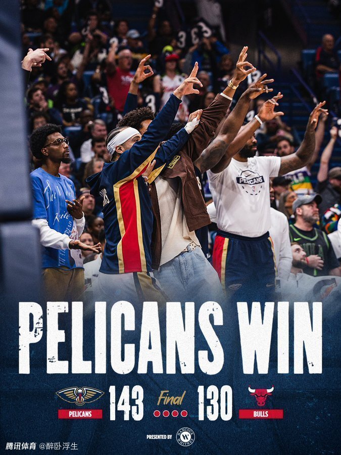 鹈鹕:锡安复出29分追平赛季单场最高分、贝20分14板3助2断、墨菲20分4板4助2断、阿尔瓦拉多16分8板8助2断、费尔斯15分4板3助、米西14分13板3帽、麦戈文斯11分3板2助、皮维10分3板2助4断。