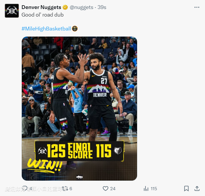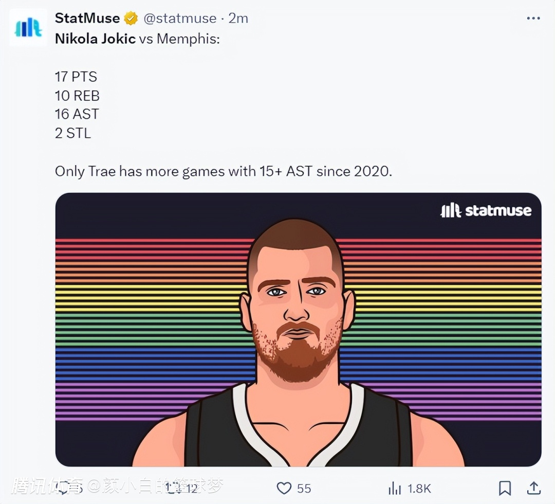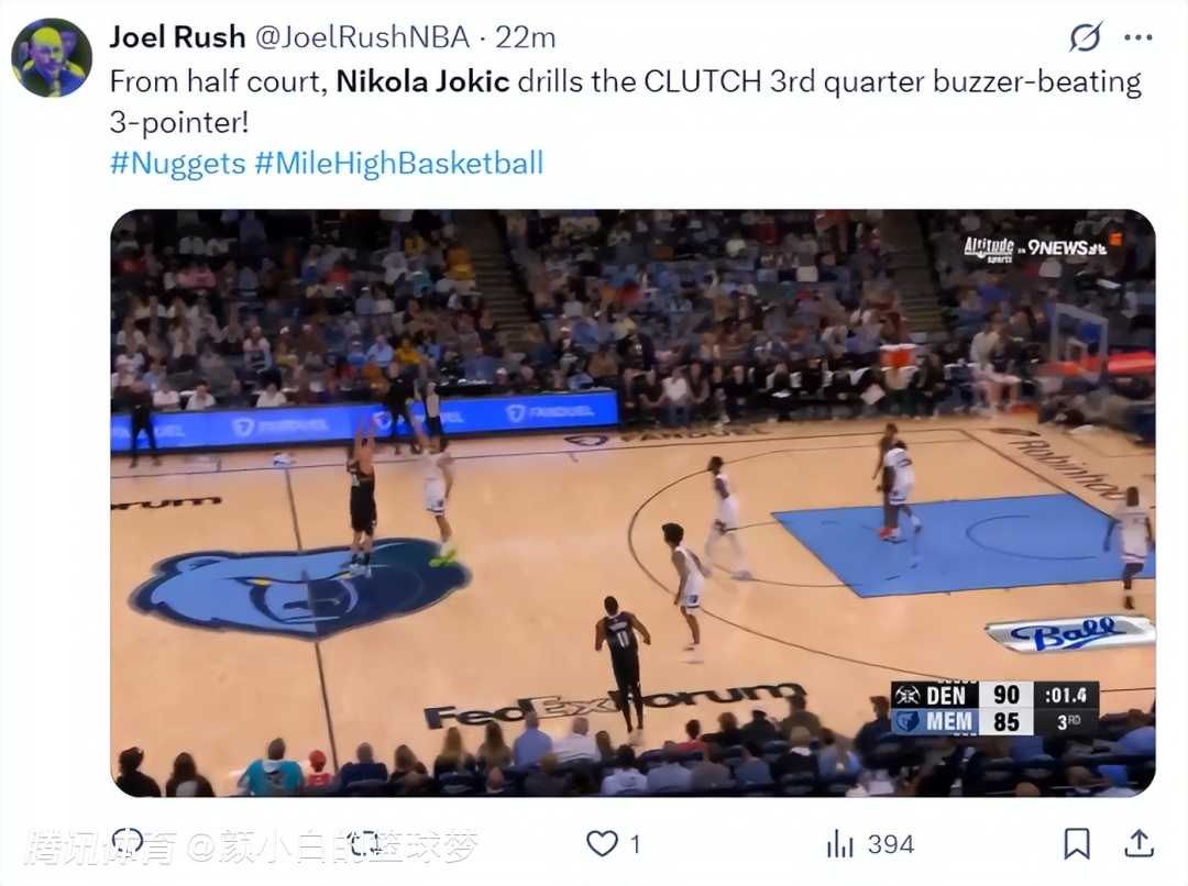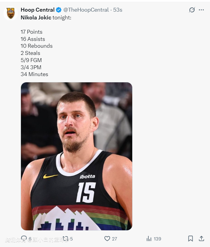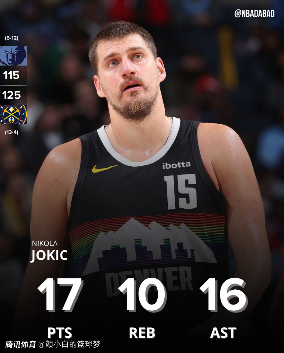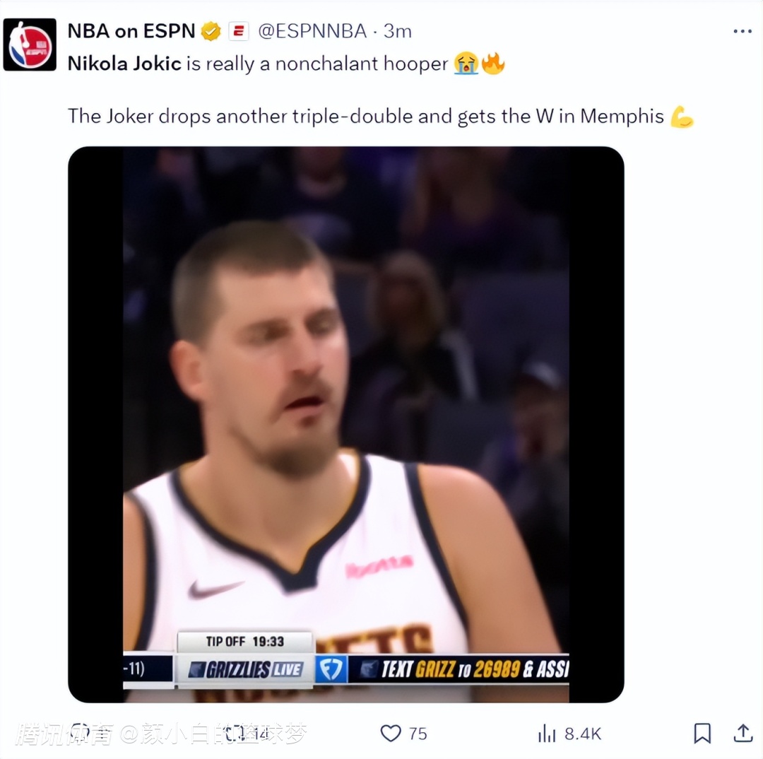 NBA on ESPN官方写道:约基奇漫不经心的拿到三双数据,他带领掘金击败了灰熊。