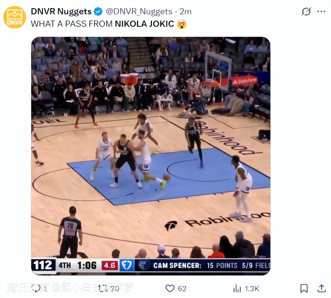 这场比赛约基奇的妙传令人叹为观止,尤其是这个面对双人包夹的转身no look pass,还是一个击地传球,实在是太精彩了。