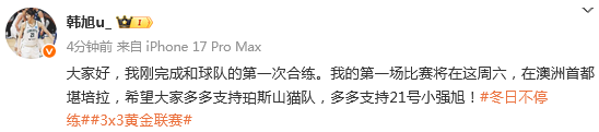 2025-11-25 20:40北京时间11月25日,中国女篮球员韩旭更新社媒发文:‘大家好,我刚完成和球队的第一次合练。我的第一场比赛将在这周六,在澳洲首都堪培拉,希望大家多多支持珀斯山猫队,多多支持21号小强旭!’。