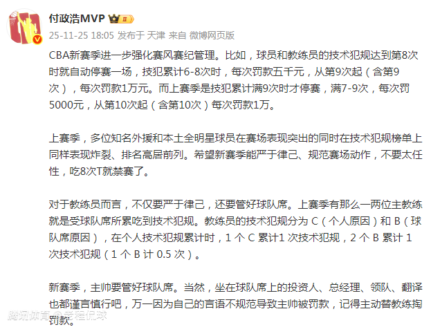 “CBA新赛季进一步强化赛风赛纪管理。比如,球员和教练员的技术犯规达到第8次时就自动停赛一场,技犯累计6-8次时,每次罚款五千元,从第9次起(含第9次),每次罚款1万元。”该媒体人说。