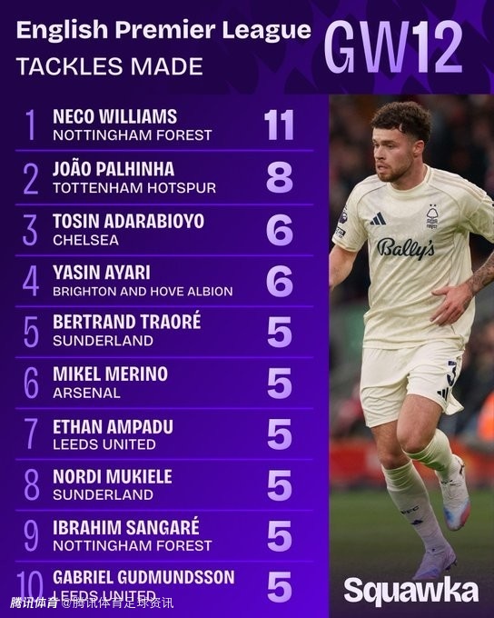 值得注意的是,威廉姆斯的这11次成功抢断不仅刷新了诺丁汉森林自重新升上英超以来的单场抢断纪录,同时也是本赛季迄今所有英超球员中的单场最高纪录。