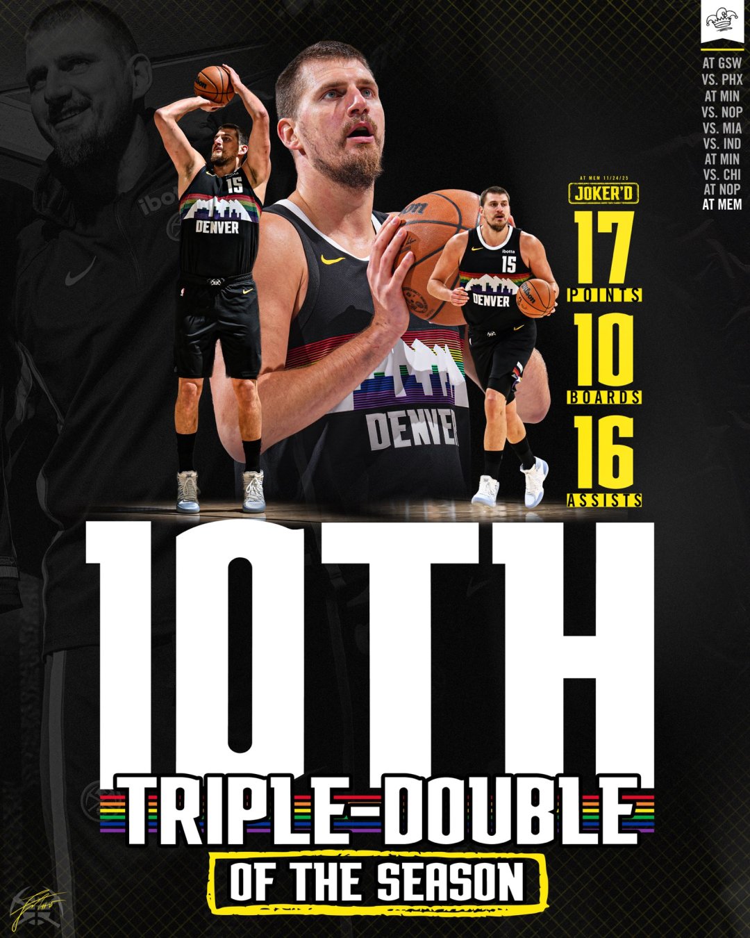 本赛季至今的17场比赛中,他场均得到29.6分、12.8个篮板和11.1次助攻,在后两项数据上领跑全联盟。他的两分球命中率达到70%,三分球命中率为43%,并且在一半以上的比赛中获得三双,同时带领战绩13胜4负的掘金队在竞争激烈的西部联盟中位居前列。