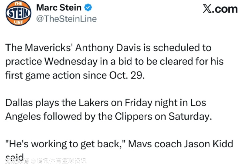 2025-11-25 23:40北京时间11月25日,据名记Marc Stein报道,安东尼-戴维斯计划于当地时间周三参加球队训练,若通过评估将获得出场许可,这将是其自10月30日以来首次重返赛场。