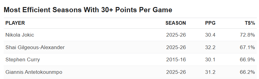 换句话说,本赛季四位顶级球员的开局数据,均跻身过去40多年来的历史最佳行列。