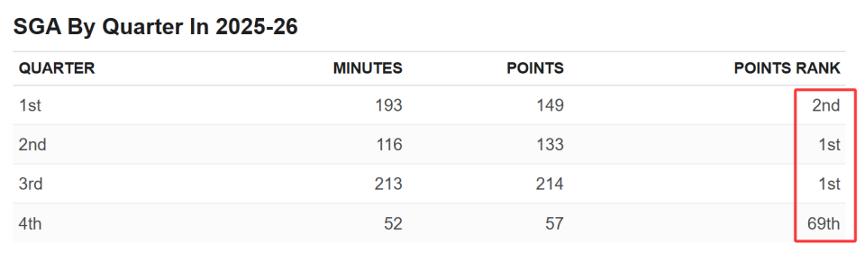 尽管雷霆队本赛季赛程相对轻松,多场比赛早早拉开分差,亚历山大极少出战第四节,但他的得分依然源源不断:他的第一节得分位列联盟第二,第二节和第三节得分均高居联盟第一——而第四节得分仅排名第69位。