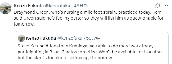 关于追梦的出场情况(轻度脚踝扭伤恢复期),科尔说道:“他今日已参加训练,自己表示感觉有所好转,所以我们会将他列为明日比赛的出战成疑球员。”