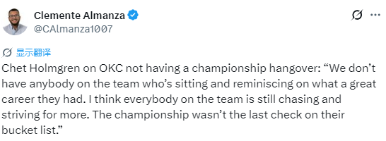 霍姆格伦表示雷霆队并无冠军后遗症,他说道:“我们队里没人会坐下来缅怀自己的职业生涯有多辉煌。我觉得队里每个人都还在追逐更多、拼搏不止,总冠军从来不是他们人生清单上的最后一项成就。”