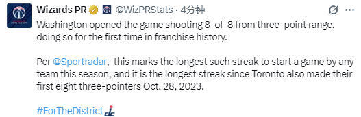 奇才队的8记三分球由CJ-麦科勒姆和基斯珀特两人命中,他们在首节各自投进了4个三分球。奇才队官方发推写道:“奇才队在比赛开局阶段三分球 8 投 8 中,创下队史首次达成该成就的纪录。据体育数据机构Sportradar统计,这是本赛季所有球队中开局连续命中三分球的最长纪录,同时也是自2023年10月28日猛龙队(同样命中前8记三分球)以来,联盟最长的开局三分全中纪录。”