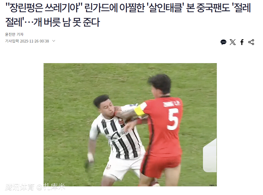 2025-11-26 10:50亚冠精英赛海港和首尔的比赛,张琳芃与林加德之间发生冲突。韩国媒体《朝鲜体育》撰文表示,张琳芃的犯规动作是屡教不改,缺乏体育道德的恶劣行为,在洲际赛场上臭名昭著。