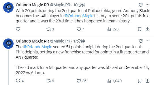魔术队在第二节比赛中单节砍下51分,刷新了队史第二节得分纪录及单节得分纪录。此前队史单节最高得分纪录为 50 分,是2022年12月对阵老鹰队的首节比赛中所创下的。而第二节得分纪录为43分,魔术队曾经两次做到过这点。