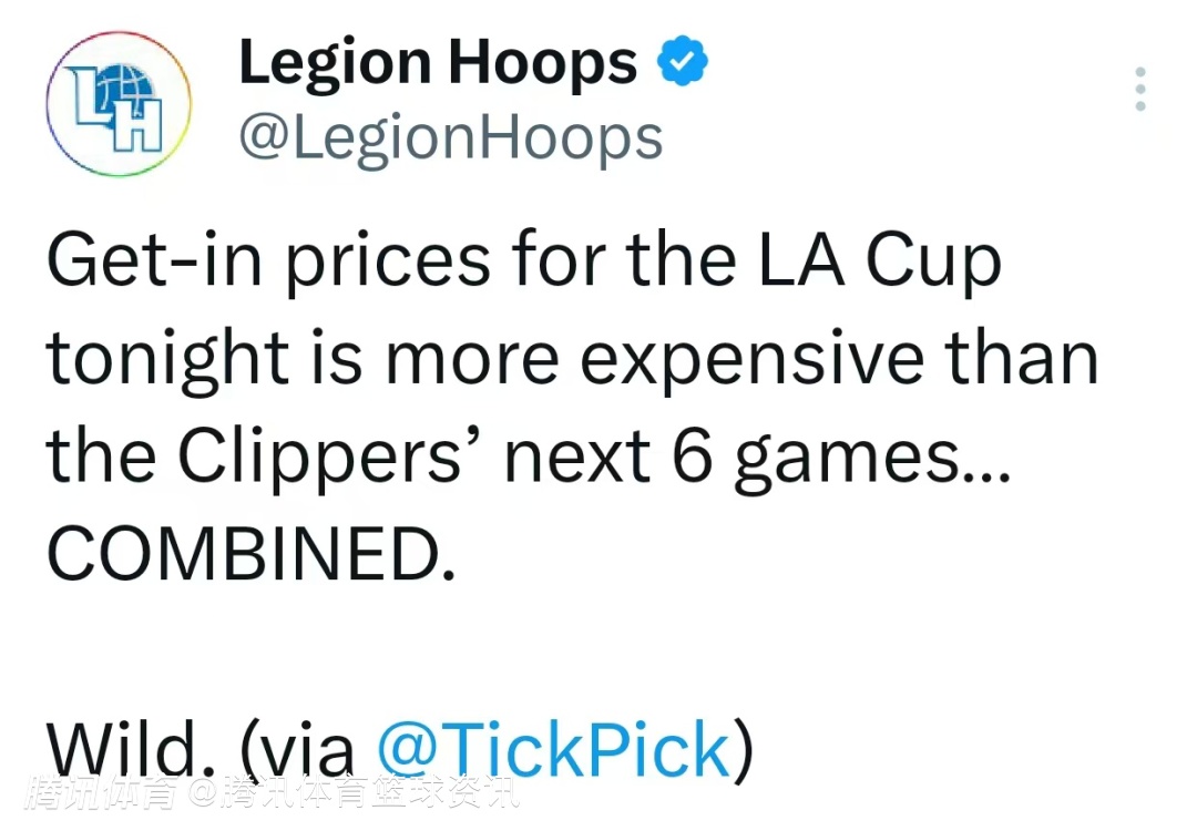 2025-11-26 11:20北京时间11月26日,NBA杯赛继续进行,快船对阵湖人。根据票务网站TickPick提供的信息显示,本场洛城德比的最低入场票价,比快船接下来6场比赛的最低入场票价加起来还要贵。