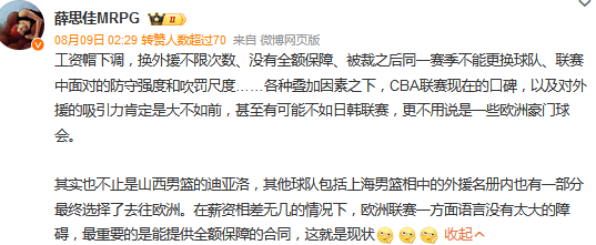 媒体人付政浩曾发文点评:工资帽下调,换外援不限次数、没有全额保障、被裁之后同一赛季不能更换球队、联赛中面对的防守强度和吹罚尺度……各种叠加因素之下,CBA联赛现在的口碑,以及对外援的吸引力肯定是大不如前,甚至有可能不如日韩联赛,更不用说是一些欧洲豪门球会。