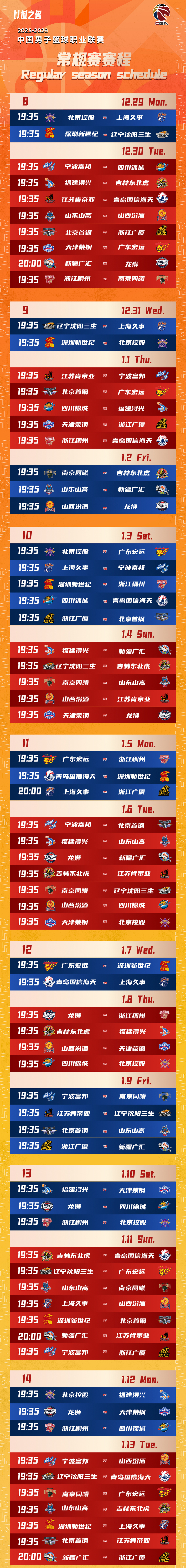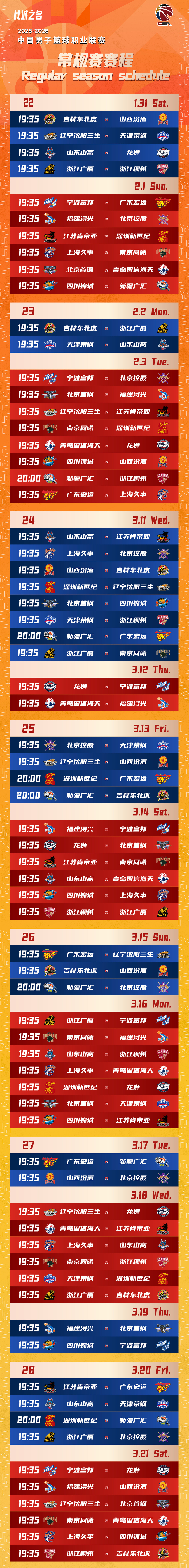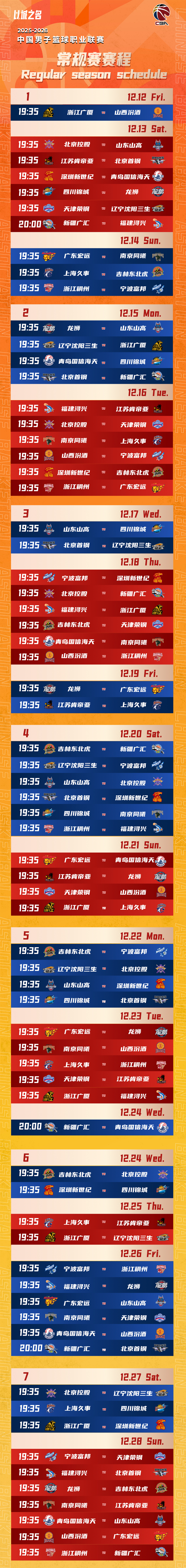 以下是CBA常规赛赛程——