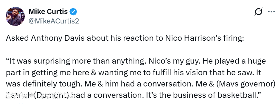 “最主要的感受是意外,”谈到总经理尼科-哈里森被炒时,浓眉说,“尼科是我很认可的人。显然,他在促成我加盟球队这件事上发挥了关键作用,也一直希望我能实现他所预见的愿景。这无疑是个艰难的结果……这就是篮球行业的常态。在与哈里森和杜蒙特分别沟通后,我得以专注于后续的康复训练,期待重返赛场、全力竞争。”