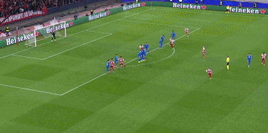 7分钟,波登斯主罚任意球兜射打高。