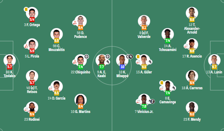 皇家马德里(4-2-3-1):卢宁;阿诺德,劳尔-阿森西奥(73'布拉欣-迪亚斯),卡雷拉斯,门迪;琼阿梅尼,卡马文加(46'塞瓦略斯);巴尔韦德,居莱尔(61'贝林厄姆),维尼修斯(90'弗兰-加西亚);姆巴佩