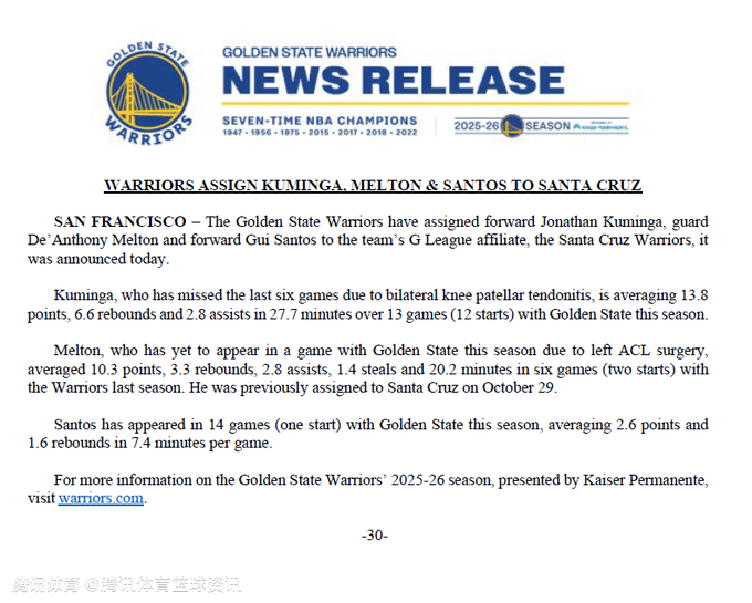 2025-11-27 06:40北京时间11月27日,勇士队官方发布公告,宣布球队已将前锋库明加、后卫德安东尼-梅尔顿及前锋吉-桑托斯下放至球队 G联盟附属球队圣克鲁斯勇士队。