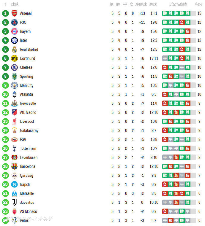 而本轮前保持不败的拜仁和国米均在本轮遭遇首败,其中拜仁在直接对话中输给阿森纳,这也是拜仁本赛季各项赛事首败,而国米则是被马竞绝杀。目前,大巴黎、拜仁、国米和皇马均为4胜1负,分别排名第2至第5位。