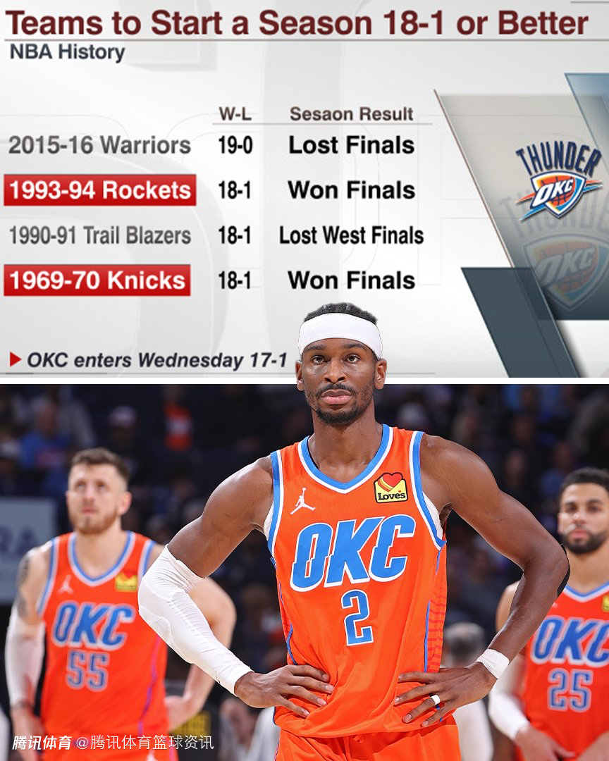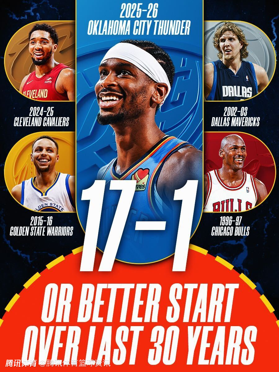 雷霆成为了过去30年第5支开季前18场比赛至少取得17胜1负的球队,其他4支是2015-16赛季的勇士(18胜0负),2024-25赛季的骑士(17胜1负)、2002-03赛季的独行侠(17胜1负)和1996-97赛季的公牛(17胜1负)。