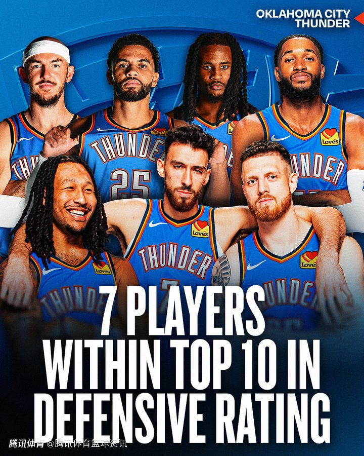 雷霆如此强大,和他们的防守分不开。官方数据显示,目前防守效率排名前10的球员,雷霆占了7位,分别是卡鲁索、米切尔、霍姆格伦、乔、杰林-威廉姆斯、华莱士和哈滕。
