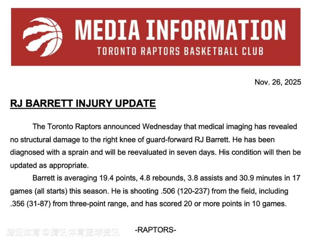 2025-11-27 09:30北京时间11月27日,猛龙队官方发布公告,宣布医疗影像显示锋卫摇摆人RJ-巴雷特的右膝无结构性损伤,确诊为扭伤,将于7天后重新评估,届时将根据情况更新其状态。