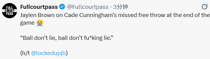 2025-11-27 10:10北京时间11月27日,NBA杯赛继续进行,凯尔特人队117-114击败活塞队,终结了对手的13连胜。凯尔特人队球员杰伦-布朗此役得到33分,赛后他接受媒体采访。
