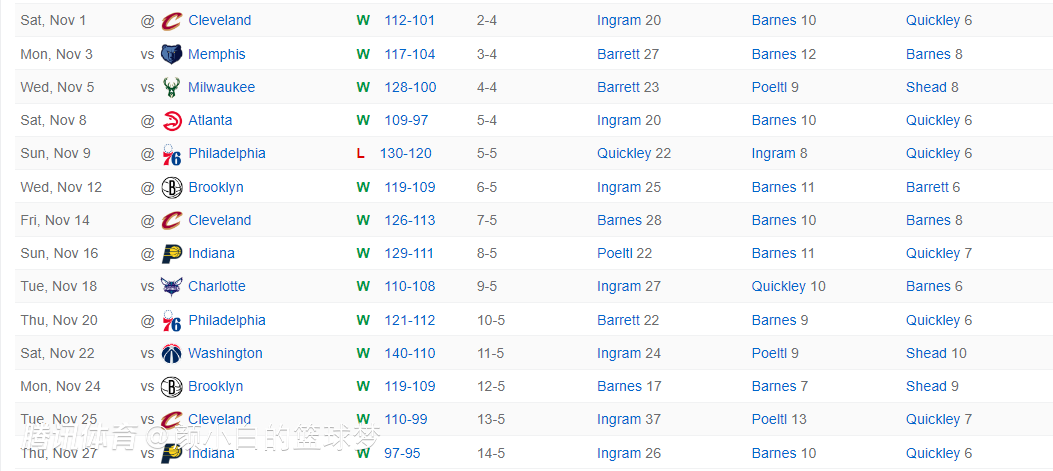 自11月1日以来猛龙取得了14战13胜的傲人战绩,目前是一波9连胜+杯赛四连胜,猛龙的战绩仅次于活塞。
