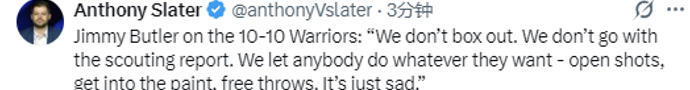 巴特勒在谈到球队的表现时说道:“我们不卡位抢篮板,不执行球探报告,让对手为所欲为,空位投篮、突破禁区、轻松罚球,这太令人失望了。我们必须提升防守。我们有足够的得分能力,但绝不能因为投篮失准就影响到防守端的表现。”在谈到球队是比赛初期表现不佳还是随着比赛进行表现下滑时,巴特勒说道:“我不知道,我也不在意。我觉得我们应该做球员应该做的事情。”
