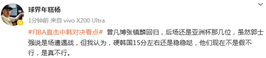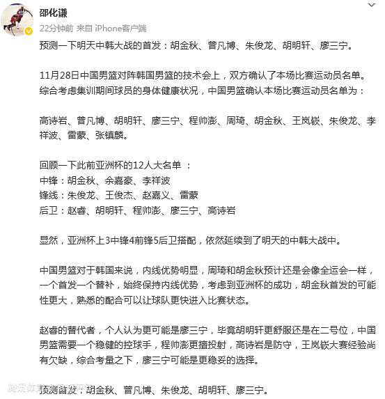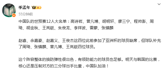 篮球记者“季孟年”发文点评:这个阵容整体的换防弹性很出色,有领防能力的球员也足够。明天与韩国的比赛,核心还是压制对方的三分球出手比重,中国队加油。
