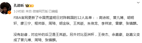 与此前亚洲杯名单相比,王岚钦替换了赵睿,周琦、曾凡博、张镇麟替换了余嘉豪、王俊杰、赵嘉义。